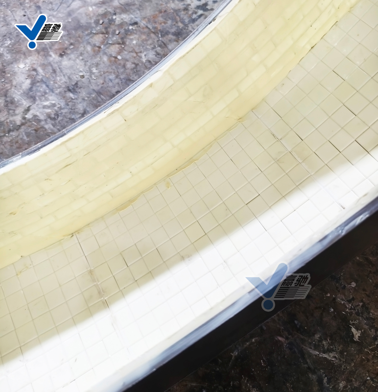 陶瓷马赛克贴片是由多个小型方形或矩形氧化铝陶瓷块(如10×10mm、15×15mm、20×20mm等)的耐磨材料。在管道系统中,弯头、三通、变径段等部位因物料冲击和离心力作用,磨损尤为严重。传统大块陶瓷衬片在小曲率半径或异形弯道中难以完美贴合,易出现缝隙或应力集中。而陶瓷马赛克贴片具有以下优势: